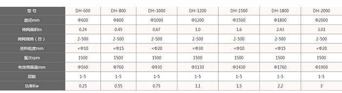 不銹鋼旋振篩分機型號有:DH-400mm、DH-600mm、DH-800mm、DH-1000mm、DH-1200mm、DH-1500mm、DH-1800mm、DH-2000mm等八種標準型號。(可以按照用戶的需求進行特殊型號定制)