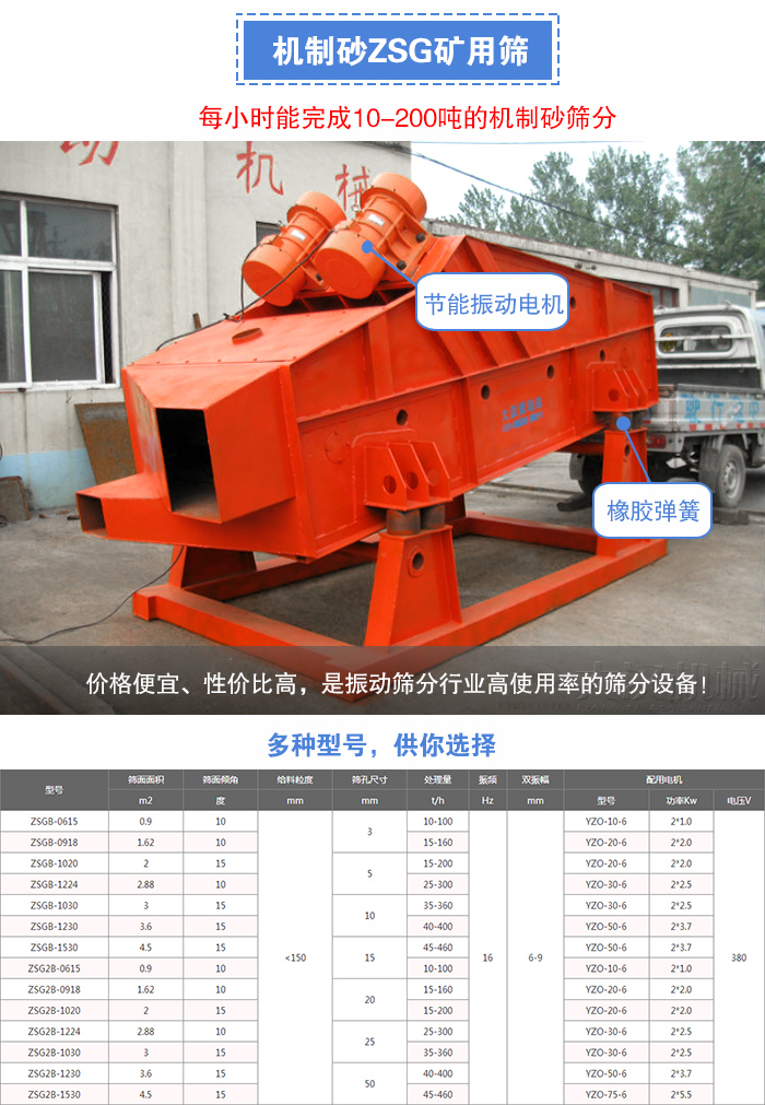 ZSG礦用振動篩是我公司自主研發(fā)得一種新型,高效的篩分設備,主要用于冶金,礦山,煤炭,建材等大規(guī)模生產(chǎn)線使用。每小時能完成10-200噸的機制砂篩分,采用能耗低振動電機作為振動源,橡膠彈簧支撐并隔振,處理量大篩分效率高,篩網(wǎng)有較大的安裝傾角,拼塊,更換方便,使用壽命長。