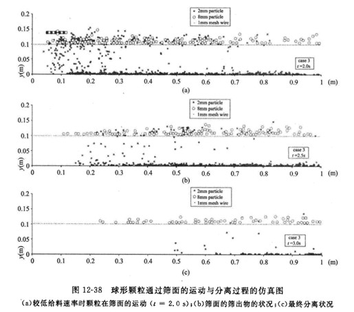DEM仿真的過程信息能夠在線不同篩分工作條件下顆粒再篩面的運動、顆粒同篩面之間的碰撞過程、顆粒通過篩網的分離過程,反映了不同力度顆粒在篩面上運動形態的差異,再現不同振動篩分機工作條件下顆粒運動過程,較為真實的描述顆粒同篩面之間的碰撞過程。圖12-38為Li等人模擬2mm和8mm球形顆粒通過篩面的運動與分離過程圖。